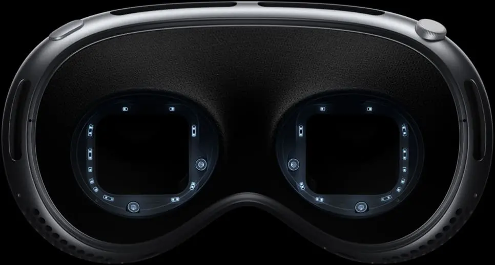 얼굴 추적 카메라 6대, 시 추적 카메라 4대, 주변 광 센서 등 최첨단 센서와 카메라가 탑재된 애플 비전 프로 내부모습